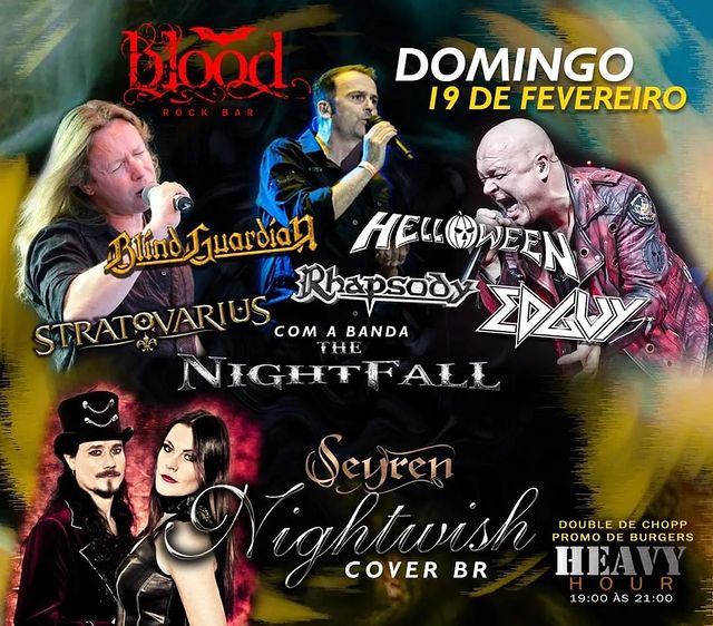O Blood Rock Bar abrirá suas portas no domingo de carnaval, dia 19 de fevereiro, para tributos aos gigantes das vertentes mais melódicas do heavy metal. Uma das atrações é a Seyren, tributo a banda finlandesa Nightwish, uma das maiores bandas do mundo, que mescla o peso do Metal com vocais líricos. A Nightfall apresentará músicas de bandas como Helloween, Stratovarius, Blind Guardian, Edguy e Rhapsody, entre outras.