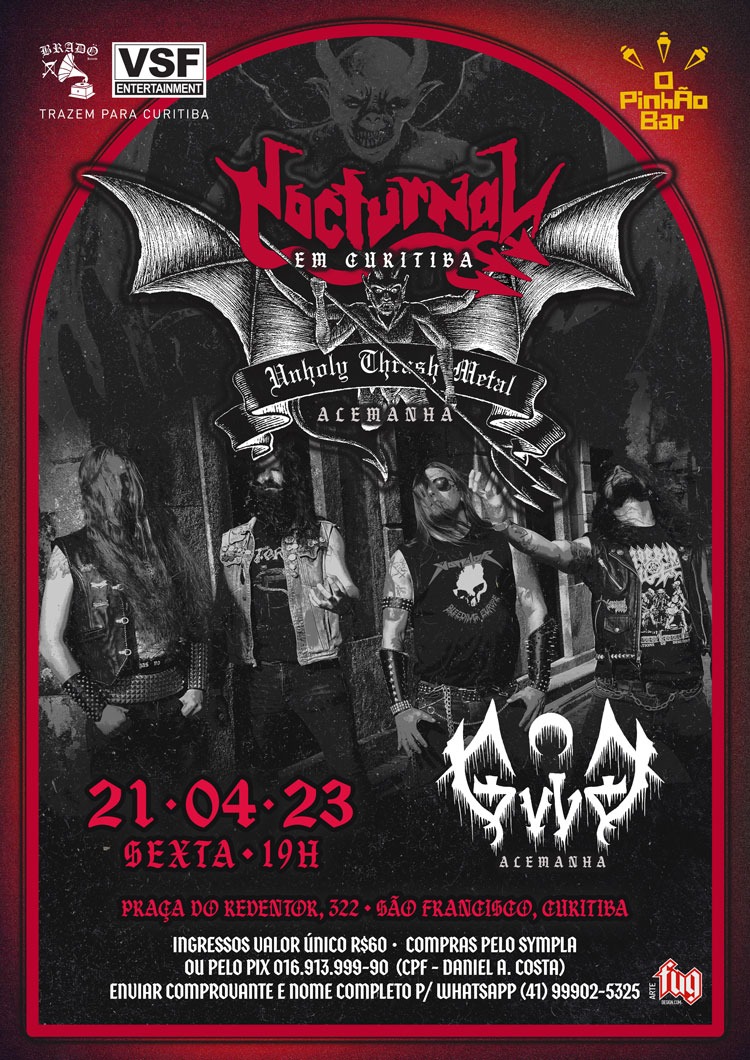 As bandas alemãs Nocturnal e GVLA se apresentam juntas em Curitiba, no dia 21 de abril (sexta-feira), feriado. Os shows serão realizados no O Pinhão Bar, situado na região central da cidade (em frente a Praça do Gaúcho). Os ingressos tem valor único, de R$ 66, e estão disponíveis no Sympla.