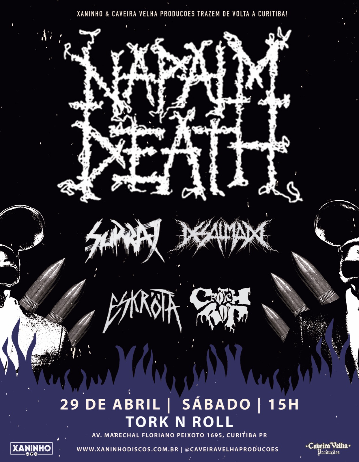 O grupo britânico Napalm Death é considerado por muitos como um dos pais do grindcore, estilo que prima pela velocidade e agressividade. O show da banda em Curitiba, agendado para o dia 29 de abril (sábado), será realizado no Tork n Roll, um dos maiores bares de Rock da América Latina.