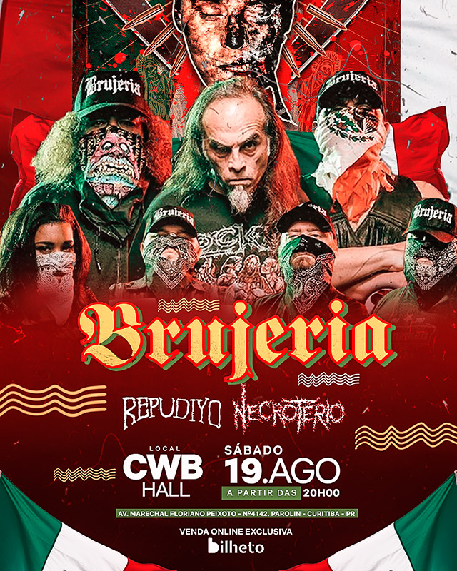 O Brujeria está de volta ao Brasil! Curitiba está novamente na rota do grupo de origem mexicana, mas que tem membros de outras nacionalidades. A apresentação, dessa vez, será realizada no CWB Hall, dia 19 de agosto (sábado). Vale frisar que o CWB Hall está atualmente em outro endereço! Confira abaixo, no serviço, as informações completas!