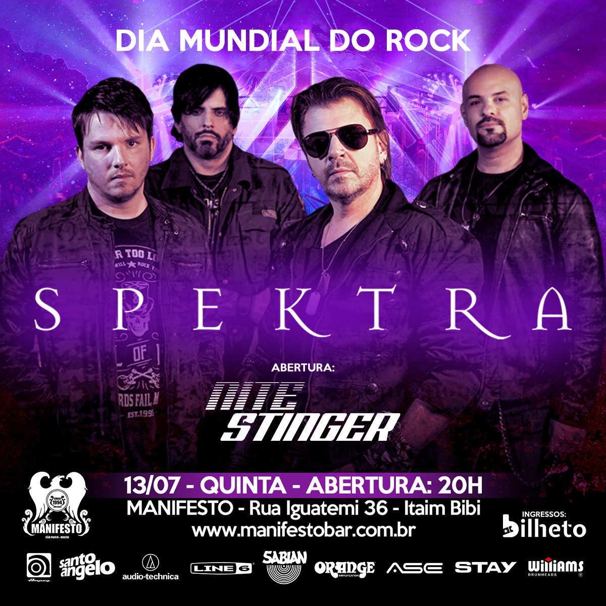 Venda online: https://bilheto.com.br/evento/1530/Dia_Mundial_do_Rock_-Bandas_Spektra_e_Nite_Stinger