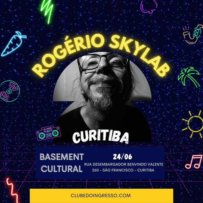 O genial e primitivo Rogerio Skylab retorna a Curitiba após mais de uma década. O artista fará duas apresentações no Basement Cultural, no dia 24 de junho, sábado. A primeira sessão, das 20 horas, está esgotado. A segunda, que começa 23h59, tem ingressos a venda por R$ 80.