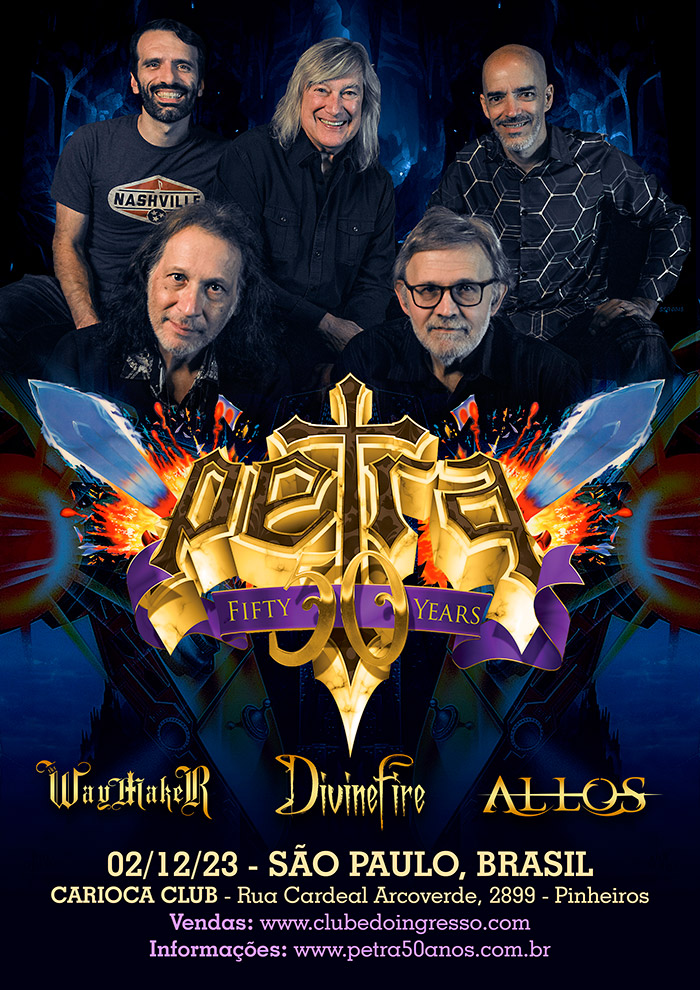 Após onze anos desde a última apresentação do Brasil, a lendária banda cristã Petra anuncia retorno ao país. Como parte da turnê comemorativa de 50 anos, São Paulo será a cidade agraciada com aquela que, provavelmente, será a última visita do grupo ao país. O show será realizado dia 02 de dezembro, no Carioca Club, com abertura das bandas Divinefire (Suécia), The Waymaker (Suécia) e Allos (Brasil).