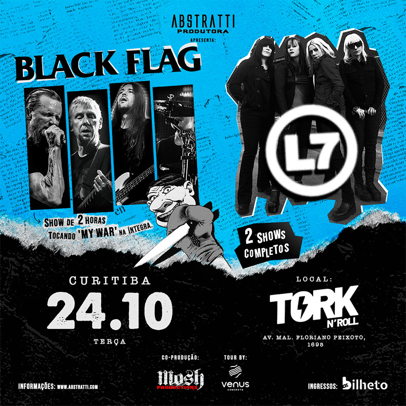 Duas bandas lendárias em seus respectivos estilos se unirão para uma única apresentação em Curitiba, no dia 24 de outubro (terça-feira), no Tork N Roll. Os grupos americanos L7 e Black Flag prometem uma noite história na capital paranaense, ambos apresentando shows completos.