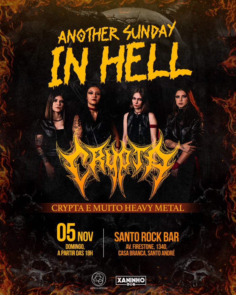 Em parceria entre a Agencia Artistica e Xaninho Discos, o Santo Rock Bar, em Santo André, anuncia show da turnê do álbum “The Other Side of Anger”, da banda nacional de death metal composta inteiramente de mulheres Crypta, no dia 5 de novembro (domingo). A Crypta é formada por Fernanda Lira (baixo e vocal), Jéssica Falchi (guitarra), Taina Bergamaschi (guitarra) e Luana Dametto (bateria).