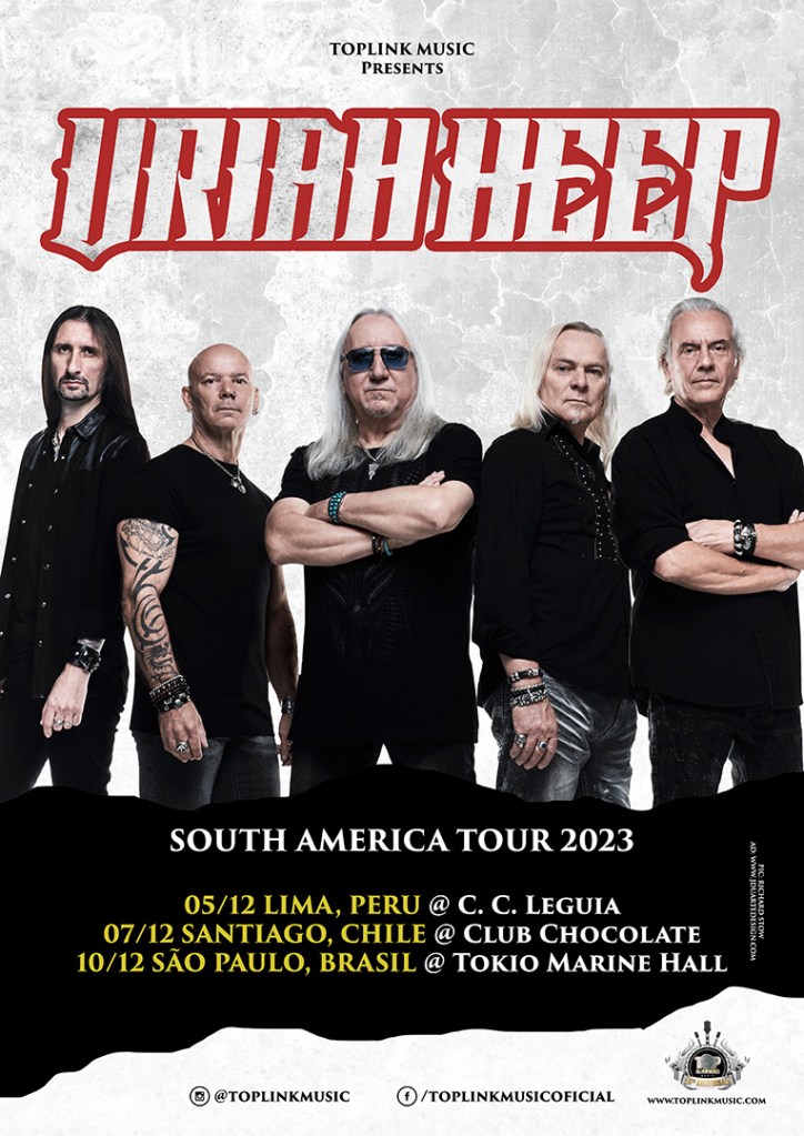 Foi anunciada nesta quarta-feira (13), uma turnê da lendária banda Uriah Heep pela América do Sul. Com mais de 50 anos de carreira e incontáveis clássicos do Rock em seu catálogo, um dos mais importantes nomes do rock mundial retorna ao continente para apresentações em Lima, Peru (05/12); Santiago, Chile (07/12) e São Paulo, Brasil (10/12), no Tokio Marine Hall.