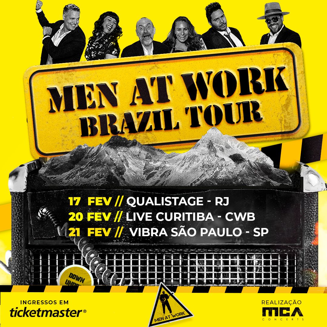 Uma das bandas ícones dos anos 80, com mais de 30 milhões de discos vendidos e ganhadora do Grammy de “banda revelação”, o Men At Work tem data para visitar o Brasil em 2024: a banda chega ao país em fevereiro do próximo ano, para três apresentações – Rio de Janeiro no dia 17, no Qualistage; Curitiba no dia 20, na Live Curitiba; e São Paulo, onde a apresentação acontece no dia 21, na Vibra São Paulo.