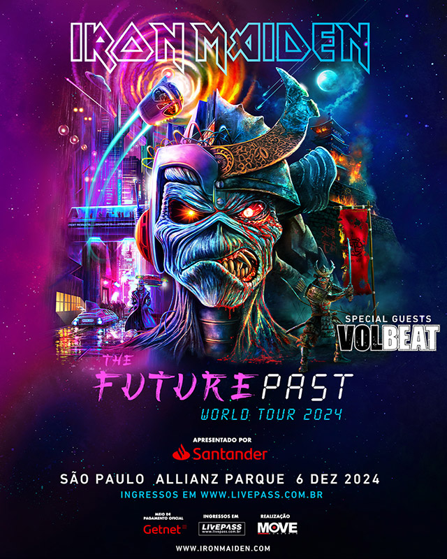 Após as apresentações aclamadas pela crítica este ano em toda a Europa, no oeste do Canadá e no recente PowerTrip Festival na Califórnia, a icônica banda britânica IRON MAIDEN anunciou o retorno da celebrada turnê mundial THE FUTURE PAST TOUR, com apresentações já confirmadas na Nova Zelândia, Austrália, Japão, EUA, Colômbia, Chile e Brasil, a partir de setembro do ano que vem. A apresentação no Brasil acontecerá apenas em São Paulo, dia 6 de dezembro no Allianz Parque e terá, ainda, como convidado especial, a banda dinamarquesa VOLBEAT.