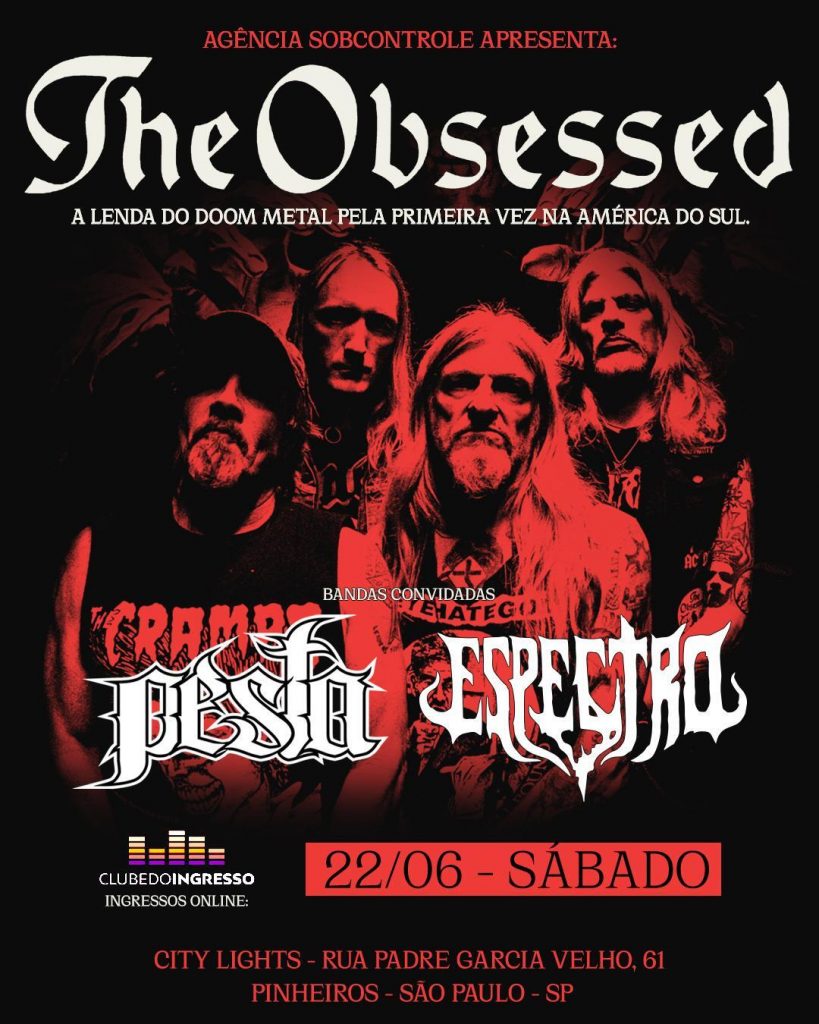 A veterana banda norte-americana The Obsessed, formada pelo lendário guitarrista e vocalista Scott ‘Wino’ Weinrich, faz a aguardada estreia no Brasil no próximo mês de junho. Em São Paulo, dia 22/06, no City Lights (Pinheiros), as bandas nacionais convidadas são Pesta e Espectro.