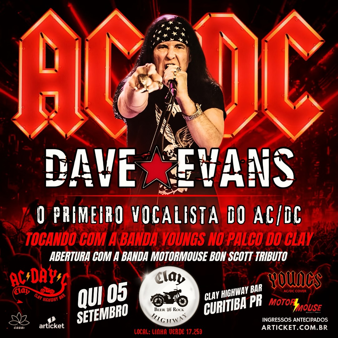 O primeiro vocalista do AC/DC foi Dave Evans. Ele, saiu antes do primeiro álbum do grupo australiano, que virou um dos maiores grupos do Rock and Roll mundial em todos os tempos. Mas gravou um single e deixou seu nome no legado. O cara já esteve algumas vezes em Curitiba e no Brasil nos últimos 10 anos, e uma nova passagem pela capital paranaense está confirmada: 05 de setembro, no Clay Highway Bar.