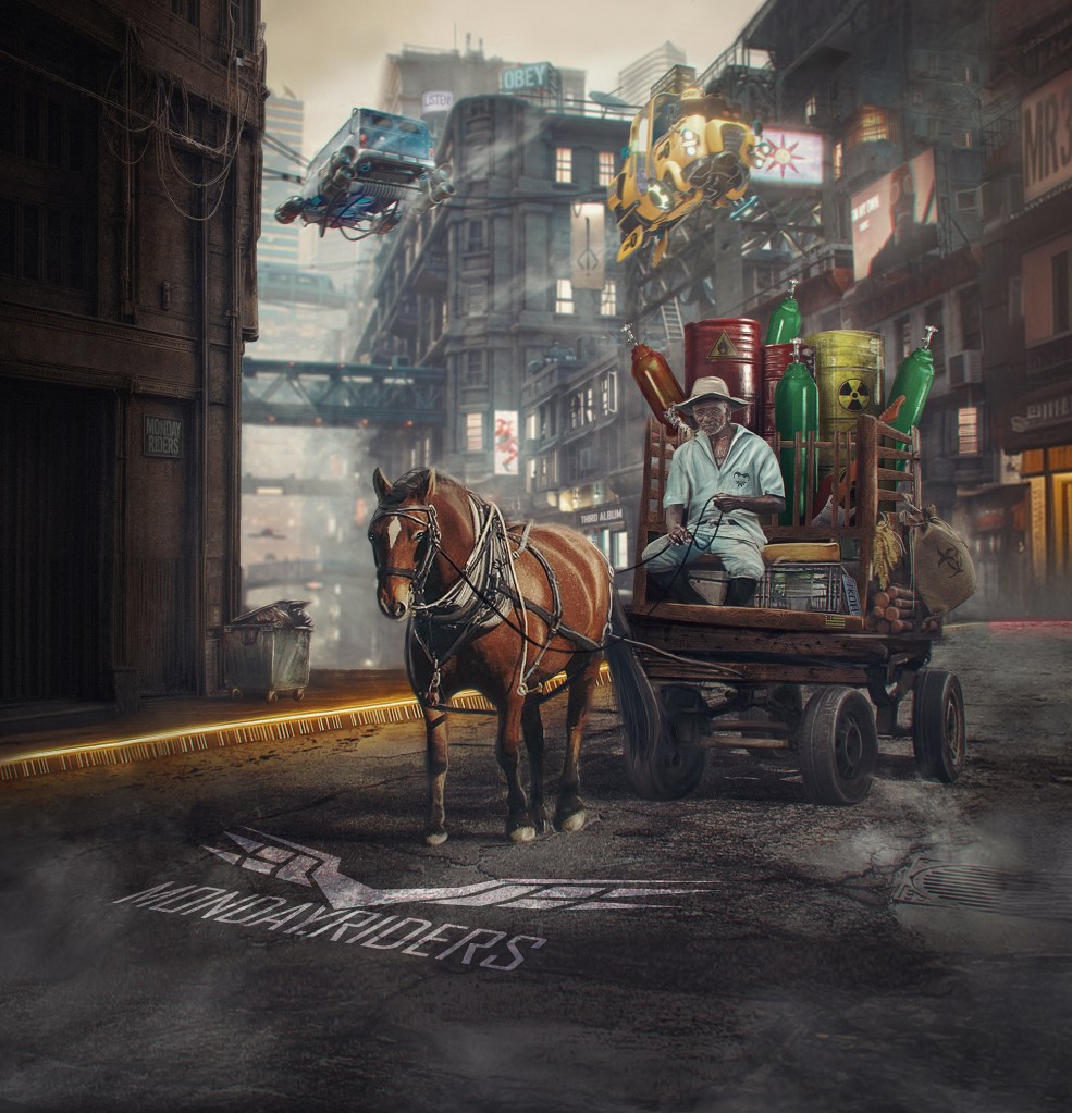 A capa do álbum Monday Riders reflete a trajetória da banda desde os ensaios iniciais, e o desafio de conciliar a vida pessoal com a dedicação ao rock autoral. A ilustração, desenvolvida pelo vocalista e refinada por Caius Augustus, simboliza o esforço de manter o rock n’ roll relevante em um mundo moderno caótico e saturado, com um senhor idoso puxando uma carroça em um cenário distópico. A imagem transmite a luta e o deslocamento do rock em um contexto contemporâneo.