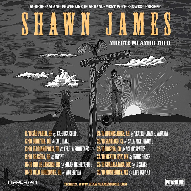 Após a bem-sucedida turnê de 2023 pelo Brasil, com dois sold outs, o músico norte-americano de folk blues rock Shawn James retorna à América Latina neste mês de outubro deste ano para uma extensa turnê de 12 datas, sendo seis no território nacional. O giro, chamado Muerte Mi Amor, em referência a uma das mais aclamadas músicas do seu álbum mais recente Honor & Vengeance, é uma realização da Powerline Music Books e da Mirror /AM.