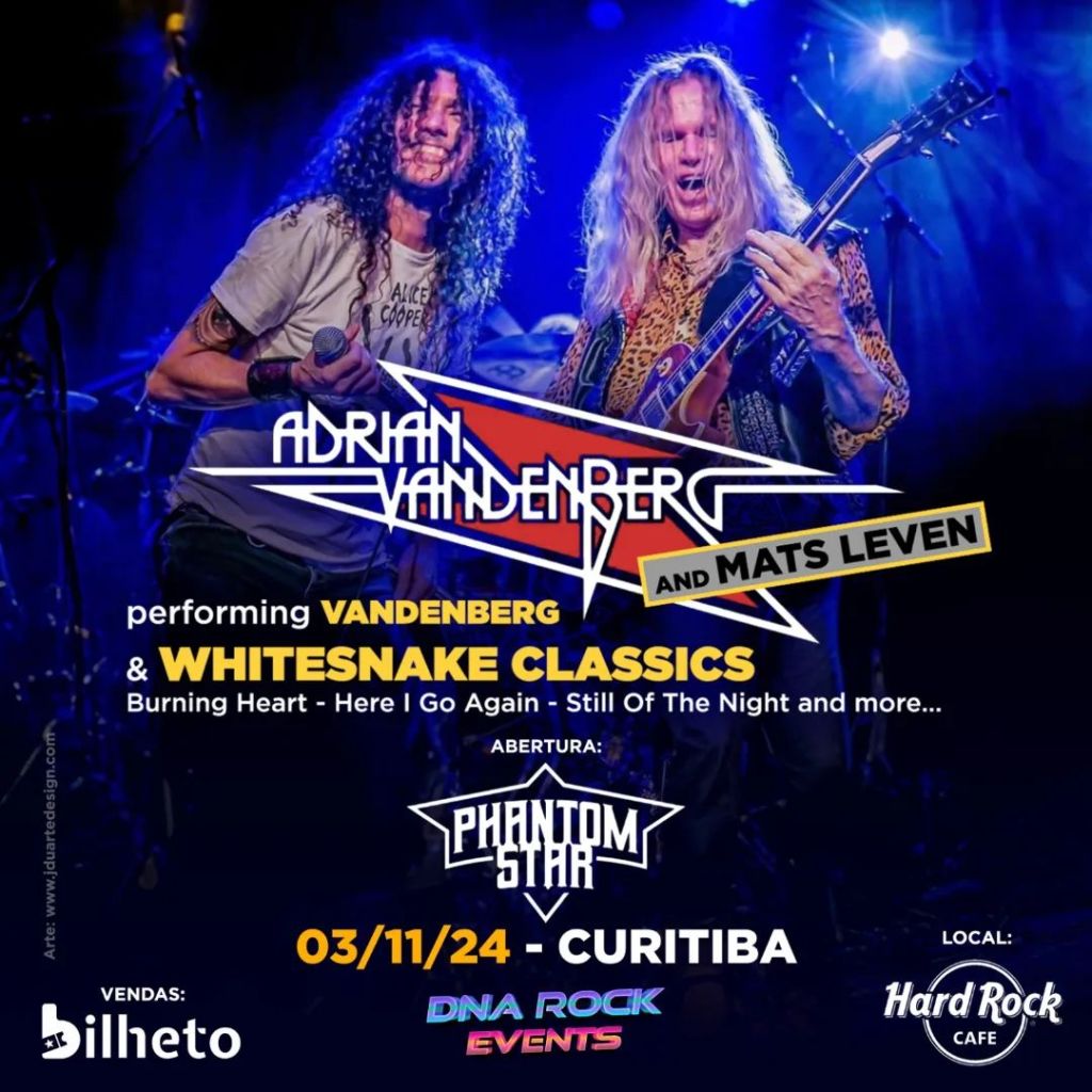 O renomado guitarrista Adrian Vandenberg e o vocalista Mats Léven estão com passagem programada para o Brasil ainda este ano. Em Curitiba, os músicos se apresentam no dia 03 de novembro, domingo, no Hard Rock Cafe. Os ingressos estão a venda pela plataforma Bilheto.