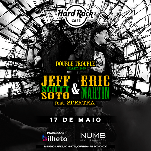 Dois ícones do rock mundial, Eric Martin (Mr. Big) e Jeff Scott Soto (ex-Yngwie Malmsteen e Journey), se encontram no palco do Hard Rock Cafe Curitiba para a Double Trouble Tour. A apresentação especial celebra os 10 anos do Hard Rock na capital paranaense e acontece no dia 17 de maio, às 20h.