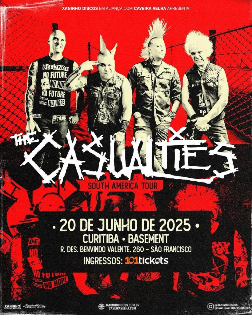 No dia 20 de junho de 2025 (sexta-feira), a icônica banda do punk nova-iorquino The Casualties pisa em solo curitibano para uma apresentação imperdível no Basement Cultural. Apesar da grande procura, os ingressos seguem à venda pelo site da 101 Tickets, com valores a partir de R$ 140 (meia-entrada), no 3º lote.