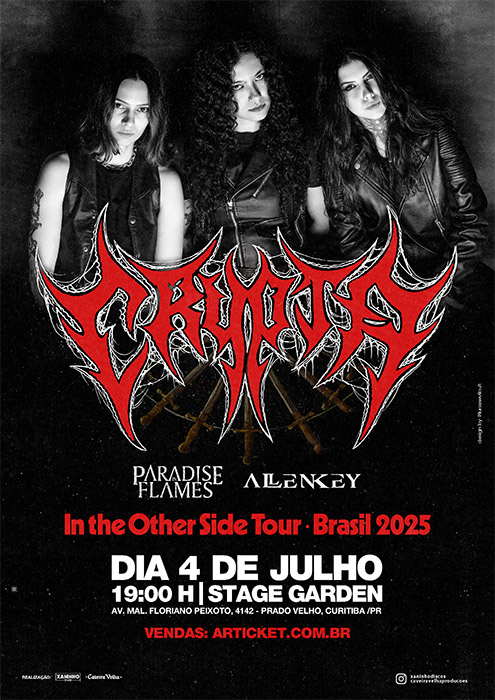 Será a sexta visita da Crypta a Curitiba desde 2022, ano em que a banda começou a fazer turnês — a última ocorreu em novembro de 2024, no palco de um Tork n’ Roll lotado. A abertura da noite – assim como de toda a turnê, que passará por todo o país durante um mês – fica por conta da Allen Key, banda paulista de hard rock, e cujo último lançamento nas plataformas digitais foi o single “Easy Prey”, e da Paradise in Flames, banda mineira de death metal sinfônico, que divulga Blindness, o quinto disco da carreira.