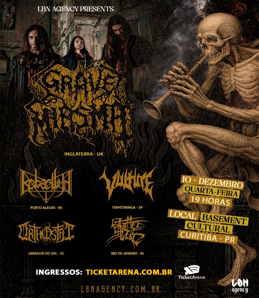 Após quase uma década, o Grave Miasma retorna ao país trazendo a turnê “Grave Miasma Latin America 2025”, com 13 shows, em dezembro passando por Brasil, Chile, Uruguai, Argentina, Colômbia e México. Como noticiamos por aqui, em primeira mão, em Curitiba, o show será realizado dia 10 de dezembro, no Basement Cultural. Quatro bandas farão a abertura da noite, sendo grandes nomes do metal extremo brasileiro: Rebaelliun, Orthostat, Vulture e Gutted Souls. Os ingressos estão disponíveis pela Ticket Arena, e custam a partir de R$ 60.