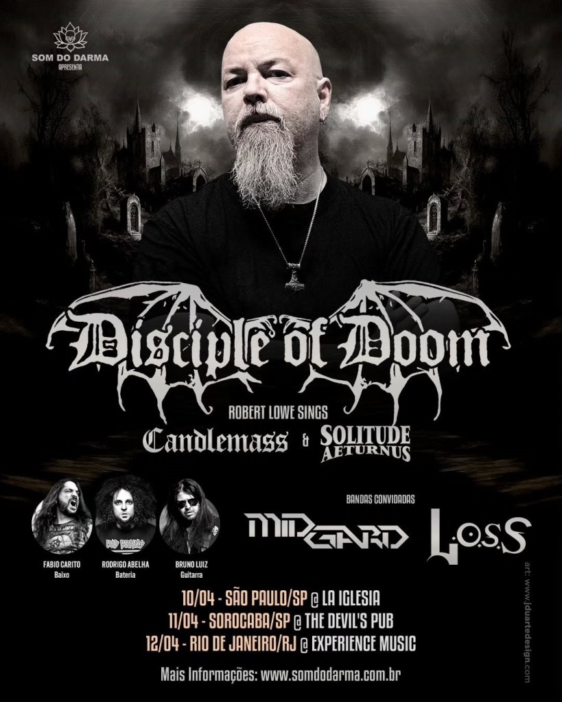 A produtora Som do Darma confirmou a primeira passagem do vocalista norte-americano Robert Lowe pelo Brasil. Conhecido por seu trabalho à frente das bandas Solitude Aeternus e Candlemass, nomes seminais do doom metal mundial, o cantor se apresenta em abril de 2026 com o projeto Disciple of Doom.