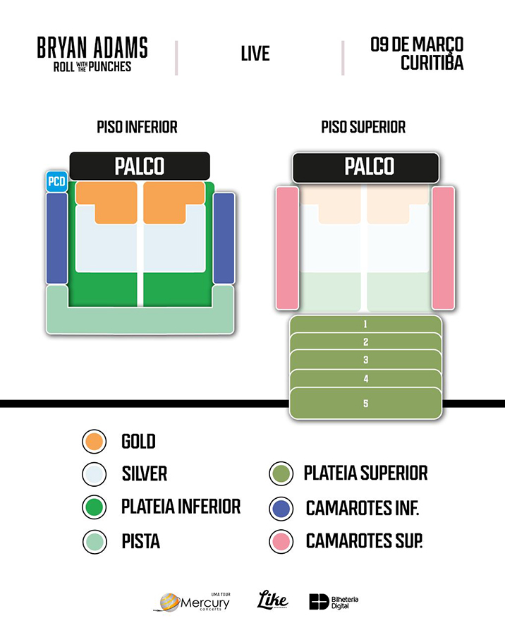 O renomado artista Bryan Adams realiza apresentação em Curitiba no dia 9 de março (segunda-feira), na Live Curitiba. O show faz parte da etapa brasileira da turnê “Roll With The Punches Tour”, produzida pela Mercury Concerts, que também passará pelo Rio de Janeiro (06/03), São Paulo (07/03) e Porto Alegre (11/03). A apresentação na capital paranaense conta com diversos setores esgotados. Ainda há setores com disponibilidade: Pista, Plateia Inferior, Plateia Silver Inferior e Plateia Gold Inferior.