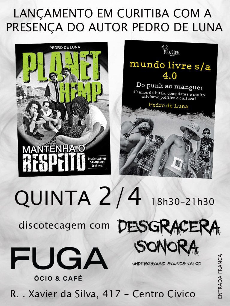 Duas das mais importantes bandas do rock nacional, uma carioca e outra pernambucana, foram homenageadas em livros com mais de 500 páginas cada um. As obras foram publicadas através de campanhas de financiamento coletivo com os fãs e, quem não participou, terá a oportunidade de adquirir as biografias “mundo livre s/a 4.0 – do punk ao mangue” e “Planet Hemp mantenha o respeito” direto com o autor, o escritor e jornalista Pedro de Luna. O evento de lançamento acontecerá na quinta-feira, dia 2 de abril, das 18h30 às 21h30, no Fuga Ócio e Café, no Centro Cívico, com discotecagem do duo Desgracera Sonora. A entrada é franca.